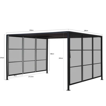 Het paviljoen beschikt over een schuifbaar dak een zonwerend doek, hiermee kun je schaduw creëren waar je maar wilt. Deze tuinpaviljoen is voorzien van een stevig staal gecoat frame met poten van 5×5 cm. De nokhoogte is 210 cm.