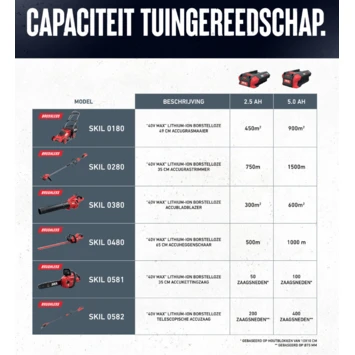 De „40V Max” SKIL 0180 is een borstelloze accugrasmaaier met een grote maaibreedte van 49 cm. Dit is het ideale gereedschap voor het maaien van middelgrote en grote gazons dankzij de indrukwekkende maaicapaciteit van max. 900m2. Net als alle andere SKIL „40V Max” accutuingereedschappen wordt dit model aangedreven door de toonaangevende, geavanceerde „PWRCORE 40™” accu- en opladertechnologie. De digitale borstelloze motor levert meer vermogen, meer efficiëntie en een 10x langere levensduur dan een vergelijkbare motor met koolborstels. De SKIL 0180 heeft niet minder dan zeven hoogte-instellingen tussen 25 en 90 mm die eenvoudig kunnen worden ingesteld. Drie werkhoogte-instellingen garanderen een flexibele werkhoogte voor maaien zonder vermoeidheidsverschijnselen met een goede werkhouding en minder belasting voor uw armen en rug. De ladingdetectie technologie van de maaier zorgt voor intelligent vermogen wat de prestaties optimaliseert. De mulchplug blokkeert het grasopvangkanaal om op natuurlijke wijze uw gazon te bemesten. Ten slotte heeft deze maaier ook nog een telescopische greep met snelontgrendeling voor compact opbergen. De SKIL 0180 AA wordt geleverd met een 5,0Ah „KEEPCOOL™”-accu, een zeer snelle „Auto PWRJUMP™” 3,0A oplader, een grote grasopvangzak van 60 liter en een mulchplug. Met de 2,5 Ah accu kun je een oppervlakte van 450 m2 maaien, met een 5,0 Ah accu kun je een oppervlakte van 900 m2 maaien.