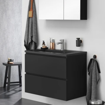 Daarnaast bestaat deze set uit een matzwarte polybeton wastafel met natuursteen look. Tijdens het ontwerpproces van de waskom is goed nagedacht over een juiste balans tussen design en functionaliteit. Polybeton wastafels zijn hygiënisch en gemakkelijk in onderhoud. De wastafel heeft een externe overloop en 1 kraangat. Voor het overloopgat wordt een sierring in zowel chroom als zwart meegeleverd waardoor deze altijd mooi aansluit bij je badkameraccessoires.
